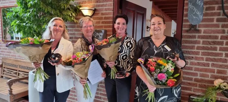 midden op de foto: Marion v.d. Kamer en Sjoukje Hetterschijt nemen de prijs namens IKC de Tragellijn in ontvangst.