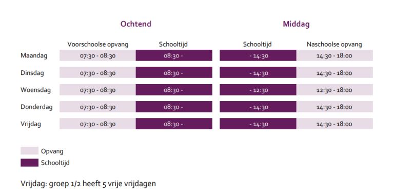 De groepen 1 t/m 8 hebben dezelfde schooltijden. Op woensdagmiddag zijn de kinderen altijd vrij. Op de overige dagen lunchen de kinderen tussen de middag op school. De leerlingen van groep 1 t/m 8 mogen vanaf 8:20 uur zelfstandig naar binnen lopen. De eigen leerkracht wacht de kinderen op in de klas vanaf 8:20 uur.